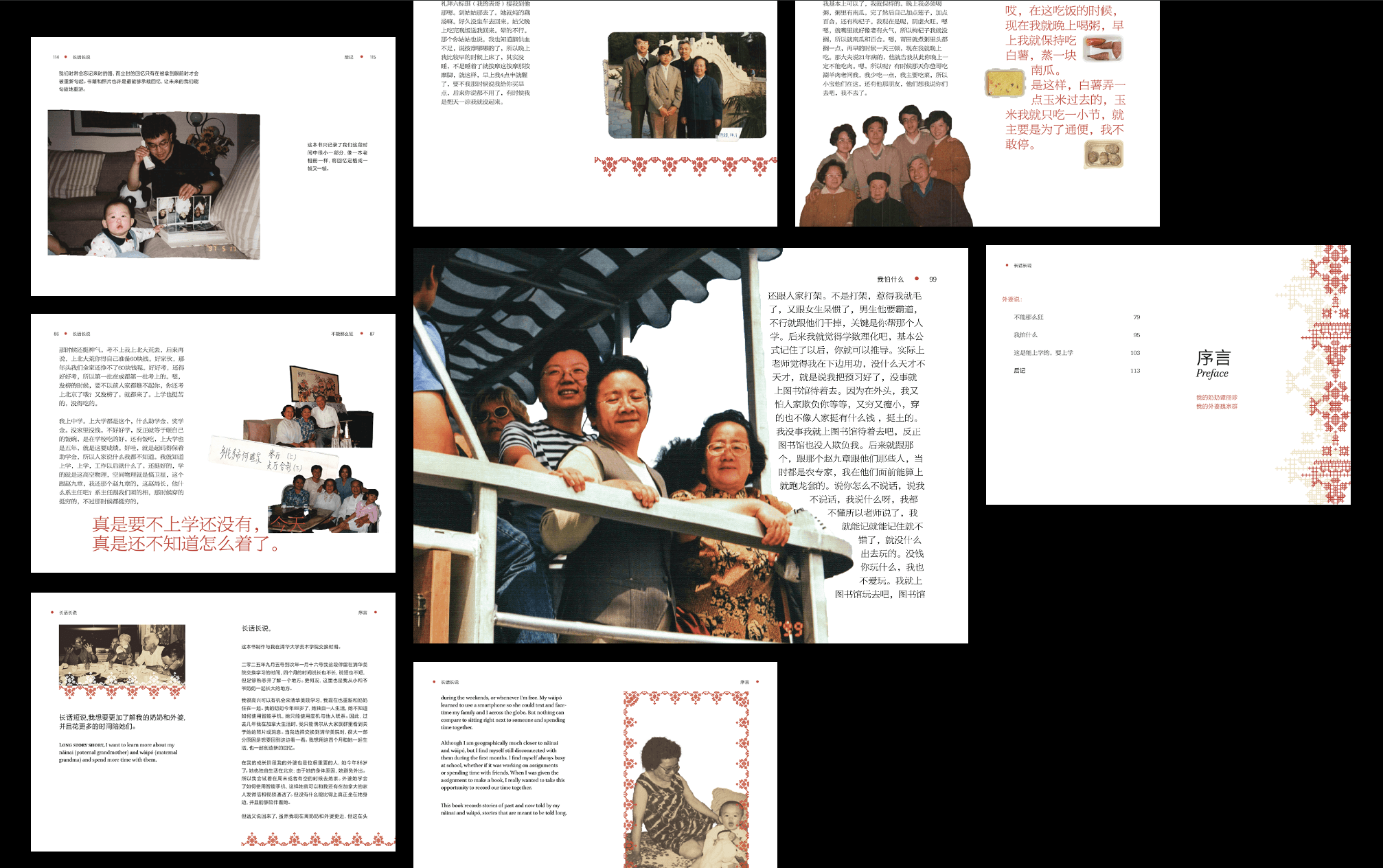 A book that records stories told by my grandmas about their lives. Each chapter of the book records a part of their lives; some are from the past and some are more recent. This book began with a simple wish: I want to spend more time with my grandmas who raised me, while I studied abroad in China.